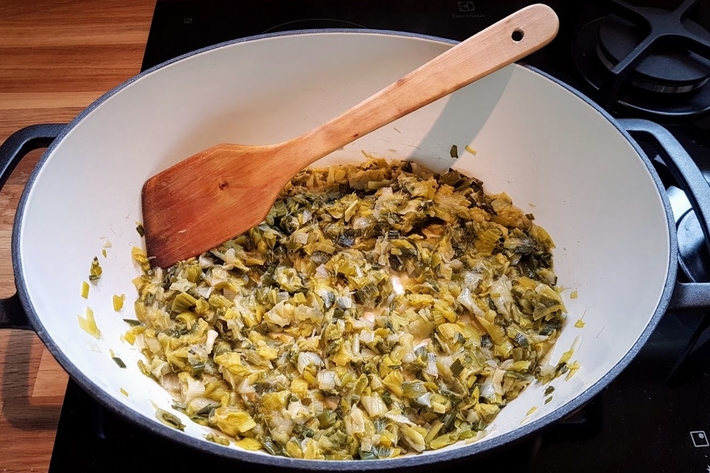 Émincez autant que les poireaux et versez les morceaux dans une cocotte avec un filet d’huile d’olive.