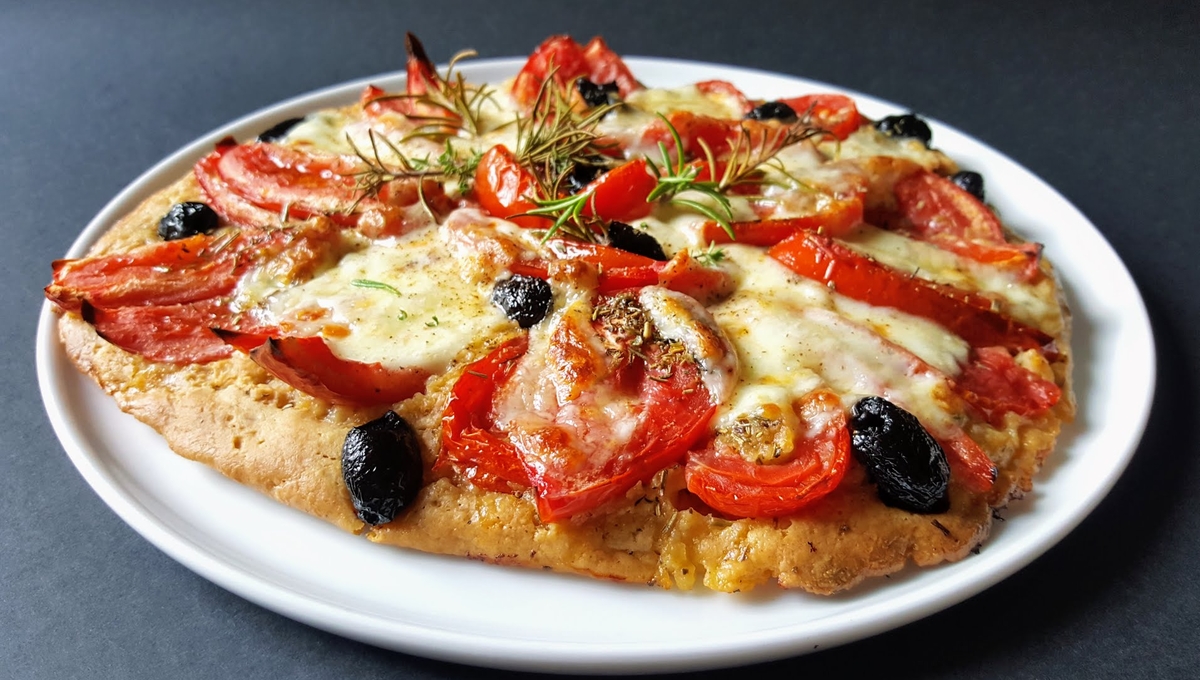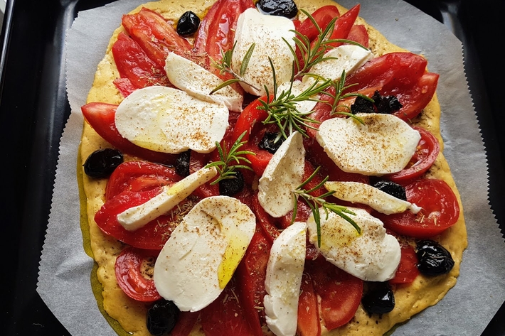 Répartissez les tomates entre les deux focacce, les olives noires, des tranches de mozzarella égouttée et un peu de romarin ou de basilic.