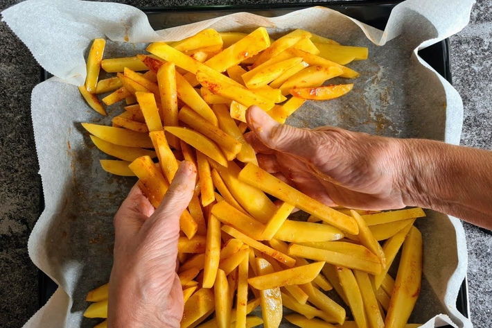 Étalez les tronçons de pommes de terre sur le papier et arrosez-les d’huile, de paprika et d’ail lyophilisé (qui relève un peu, mais pas trop).