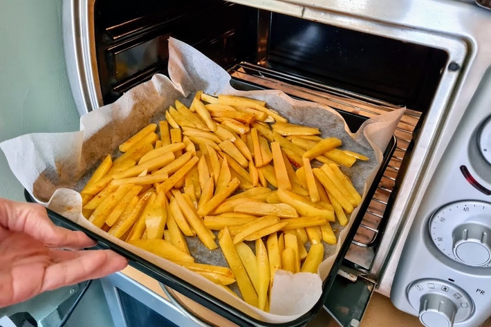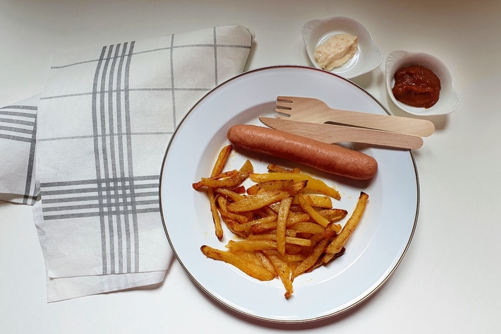 Dès que les frites vous semblent assez grillées, servez avec des knacks (saucisses typiquement strasbourgeoises), du poulet ou un steak…