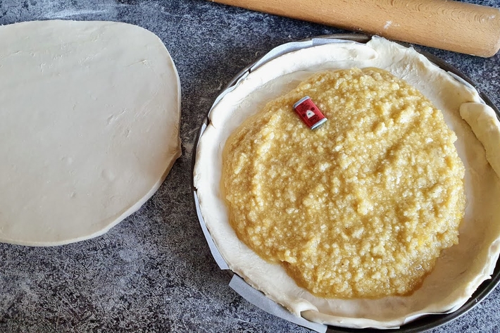 Étalez l’autre moitié de pâte en rond, un peu plus grand que la première et recouvrez-en la garniture.