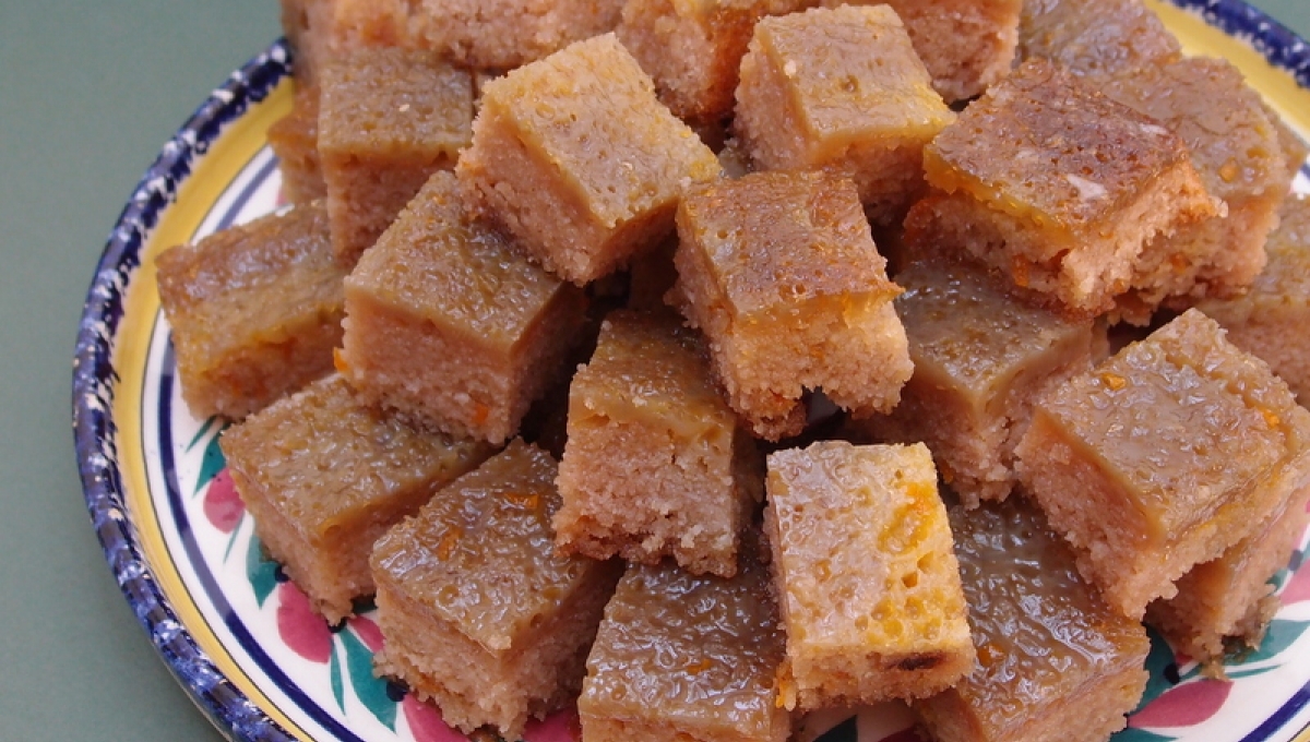Pressez l’orange et versez le jus d’une orange sur le gâteau encore tiède et faites imbiber le gâteau de jus dans une feuille de papier d’aluminium repliée sur les bords.