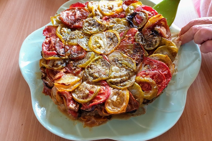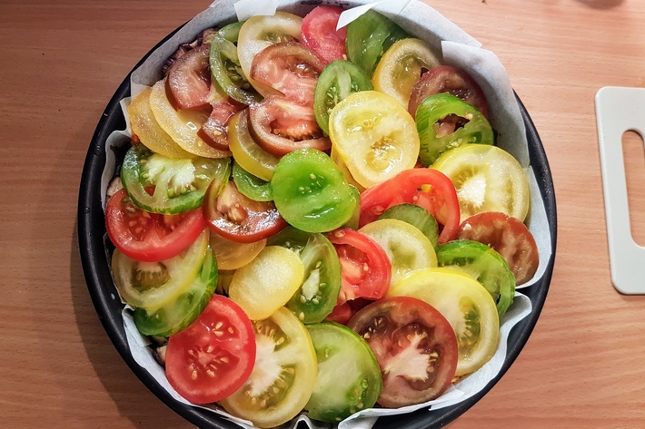 Sortez le gâteau du moule (sans le retourner pour que les tomates multicolores restent sur le dessus) en attrapant les bords du papier cuisson et en le faisant glisser sur un plat (aux bords légèrement incurvés pour que le jus ne coule pas).