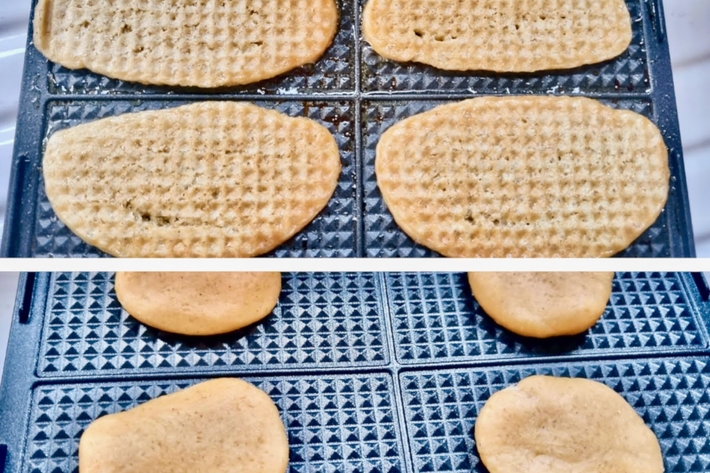 Faites cuire les portions de pâte par quatre jusqu’à ce qu’elle soient dorées. Les gaufres cuisent vite : comptez de 3 à 4 minutes par lot de quatre.