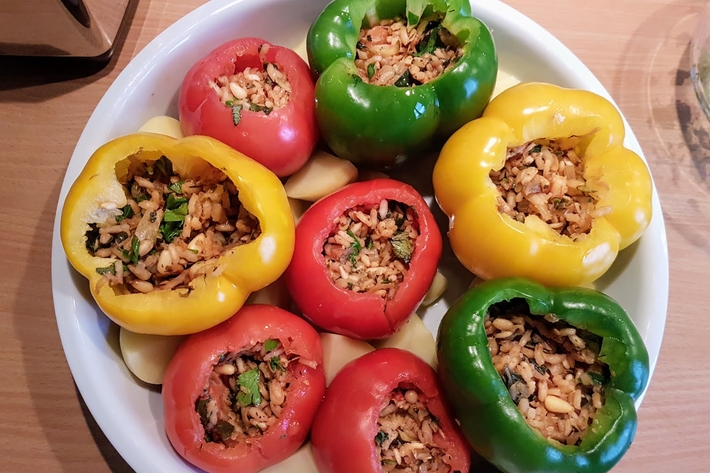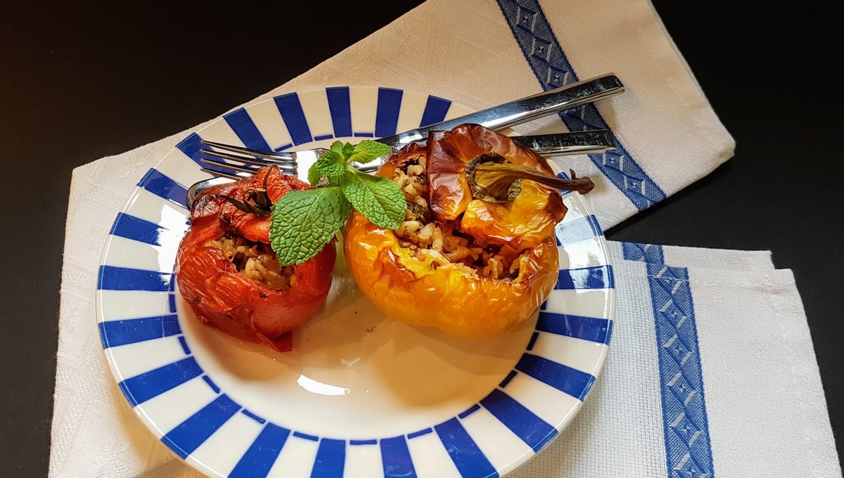 Remplissez les tomates et les poivrons (légèrement salés et sucrés à l’intérieur) aux deux tiers avec le riz, pas davantage puisque le riz continue à gonfler à la poursuite de la cuisson.