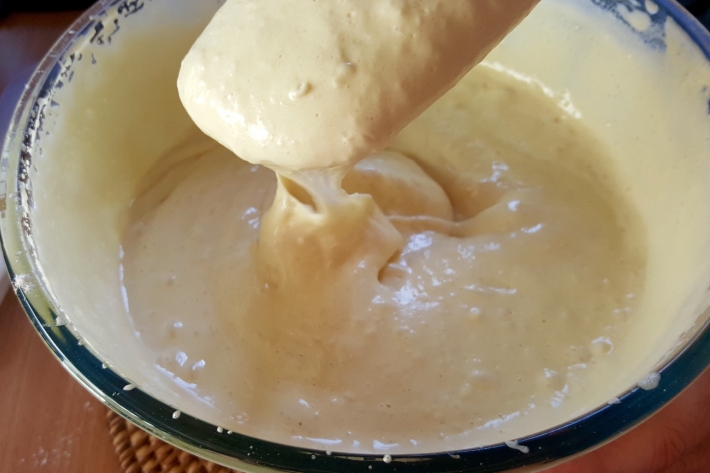 Versez la farine en plusieurs fois et en soulevant délicatement la masse.