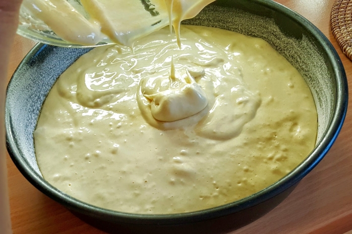 Versez doucement le beurre fondu et mélangez encore délicatement (cet ajout de beurre est facultatif).
