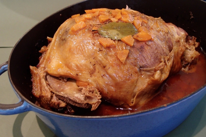 Arrosez régulièrement avec du bouillon et retournez le gigot environ 5 ou 6 fois.