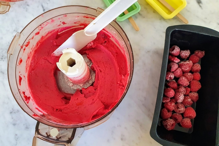 Pour peu qu’elle soit moulée dans des formes avec des bâtonnets, c’est la glace des enfants : des framboises surgelées passées au robot, mélangées à des petits suisses pour l’onctuosité et plus légers que de la crème fraîche. Un petit retour au congélateur et, hop, dans la bouche !