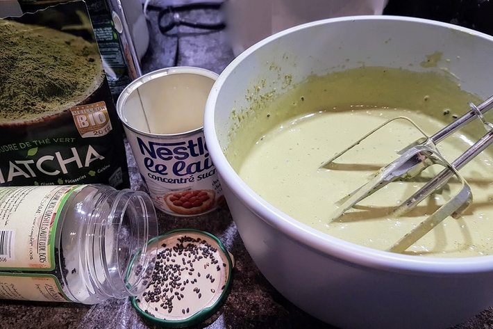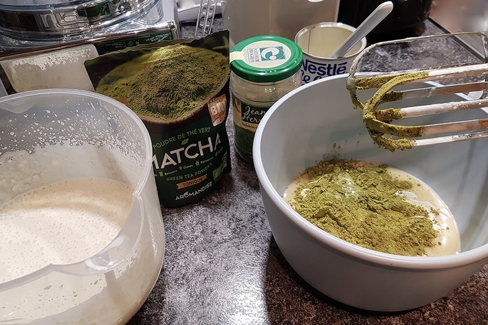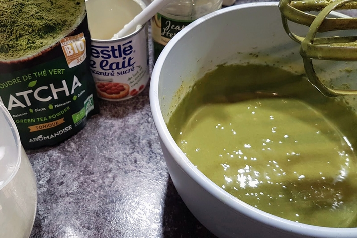 Fouettez le lait concentré avec le thé vert et incorporez la crème fouettée dans cette préparation.