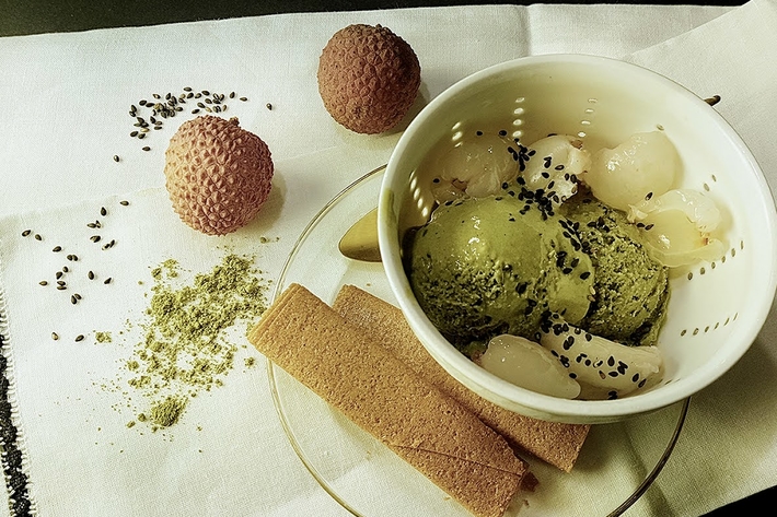 Encore une glace sans sorbetière parce que c’est très simple de faire sans. Mais c’est plus long. Qui n’a pas essayé la glace au thé vert de certains restaurants japonais (les vrais) ? Le thé vert matcha, qui se trouve dans toutes les supérettes bio ou asiatiques, donne une saveur et une couleur étonnantes. Sans œufs, cette recette est, grâce à l’indispensable lait condensé sucré, d’une simplicité enfantine pour un résultat et une texture impeccables.