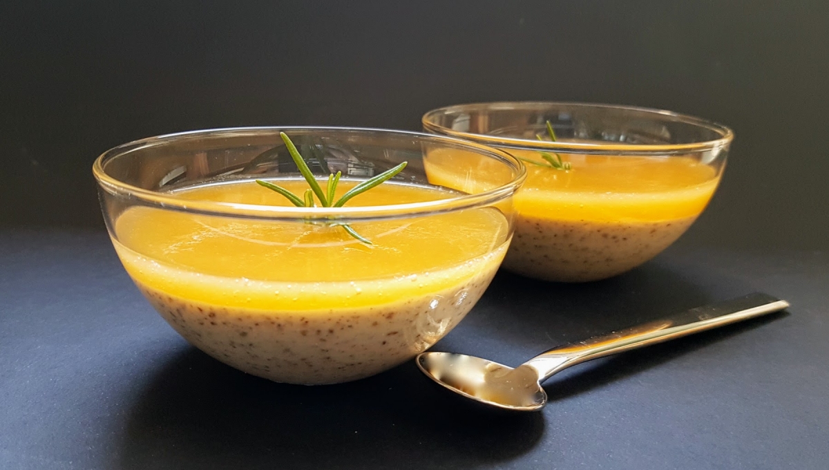 Répartissez ce mélange crémeux dans des coupelles et surmontez-le avec un coulis de fruits, des framboises entières ou un gaspacho d’abricots au romarin.