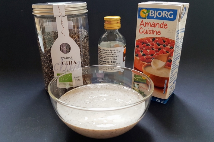 Mélangez les graines de chia, dans un bol en hauteur, avec le contenu de la brique d’Amande cuisine (mélangez assez vite parce que les graines ont tendance à s’amalgamer et faire des petits tas).