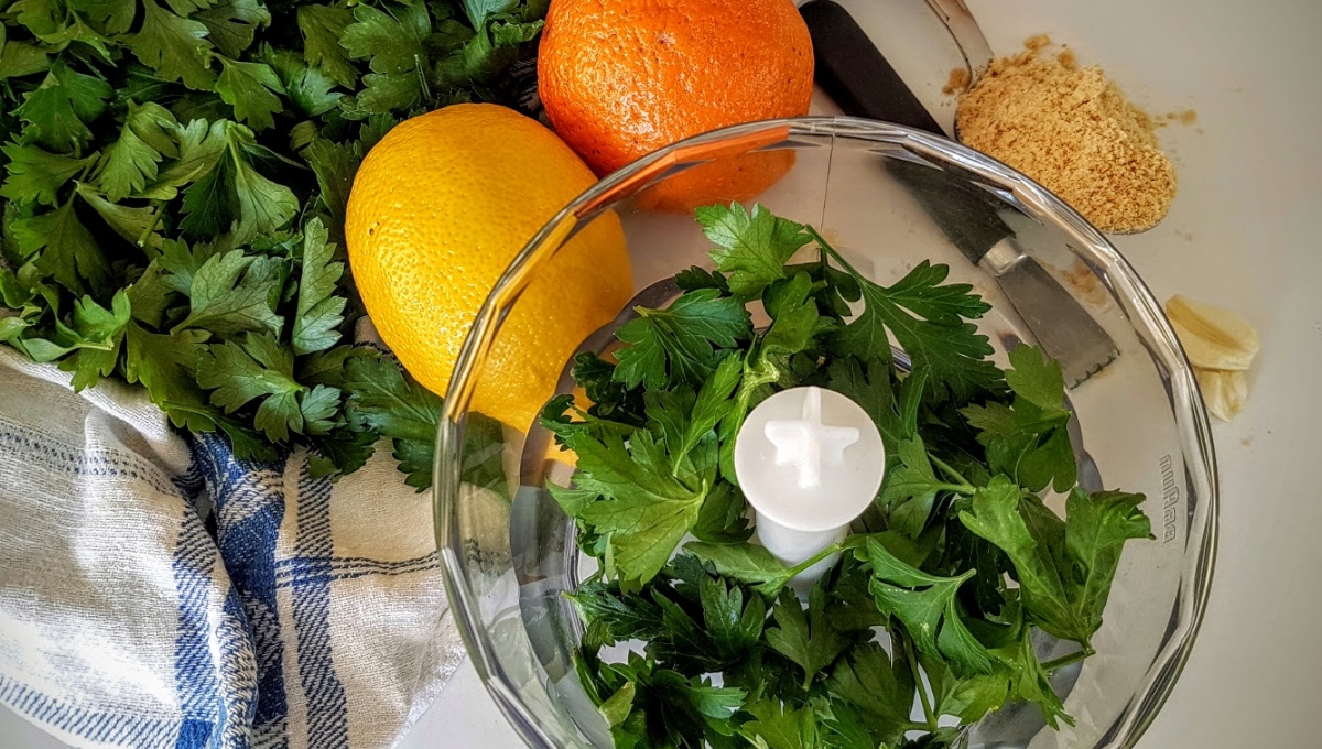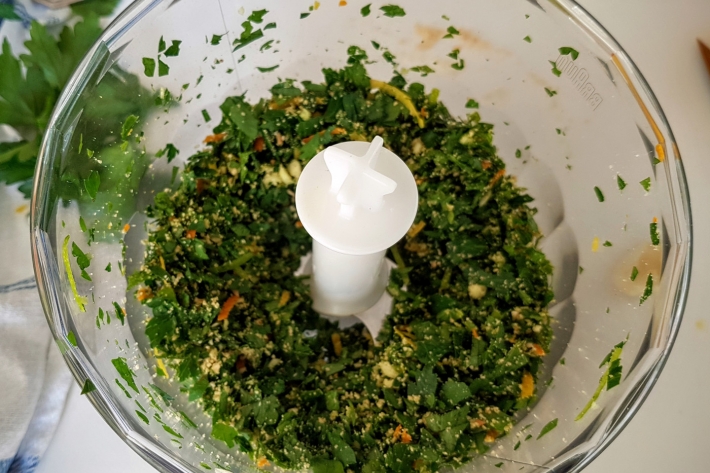 Toute une rubrique est consacrée à la gremolata dans “Elle à table” de l’été 2016. C’est un condiment qui s’ajoute à l’assaisonnement de toute salade, mais surtout qui entre à la fin de l’osso-buco alla milanese. La recette de base sa fait avec du persil, du citron, de l’orange. J’y ai ajouté du citron vert et de la coriandre. Des vitamines en-veux-tu-en-voilà !