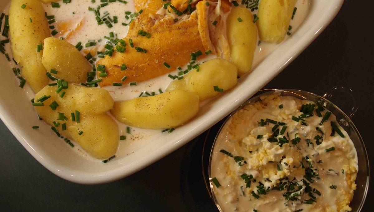 Servez le poisson et les pommes de terre avec la sauce aux œufs à part.