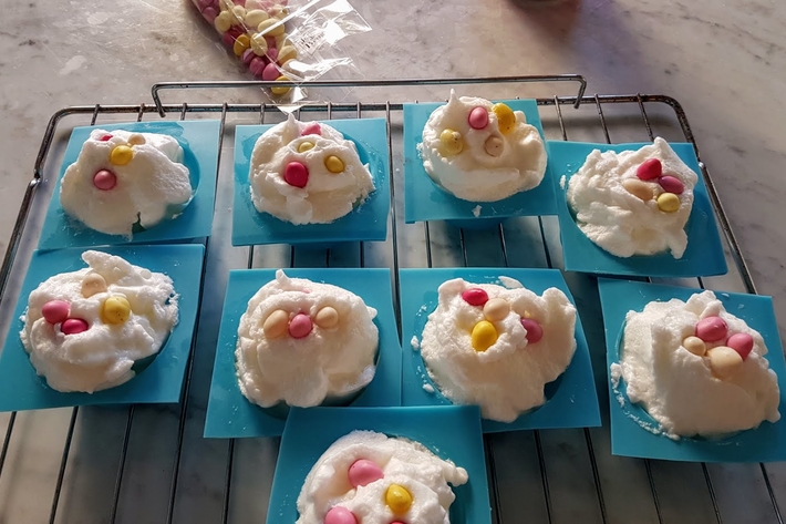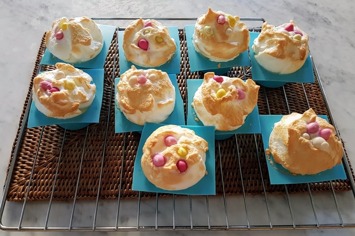 Répartissez les blancs en neige dans les moules et déposez trois ou quatre œufs en sucre dessus, et même dedans.