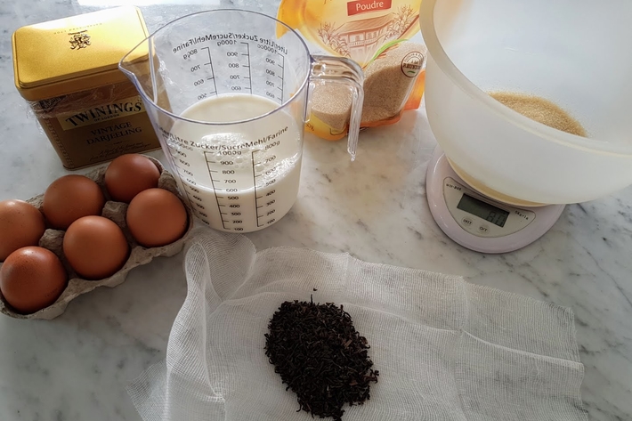 Ôtez le thé (en pressant un peu la gaze entre vos doigts pour en extraire un maximum) et versez le lait doucement sur les jaunes d’œufs, tout en remuant énergiquement.