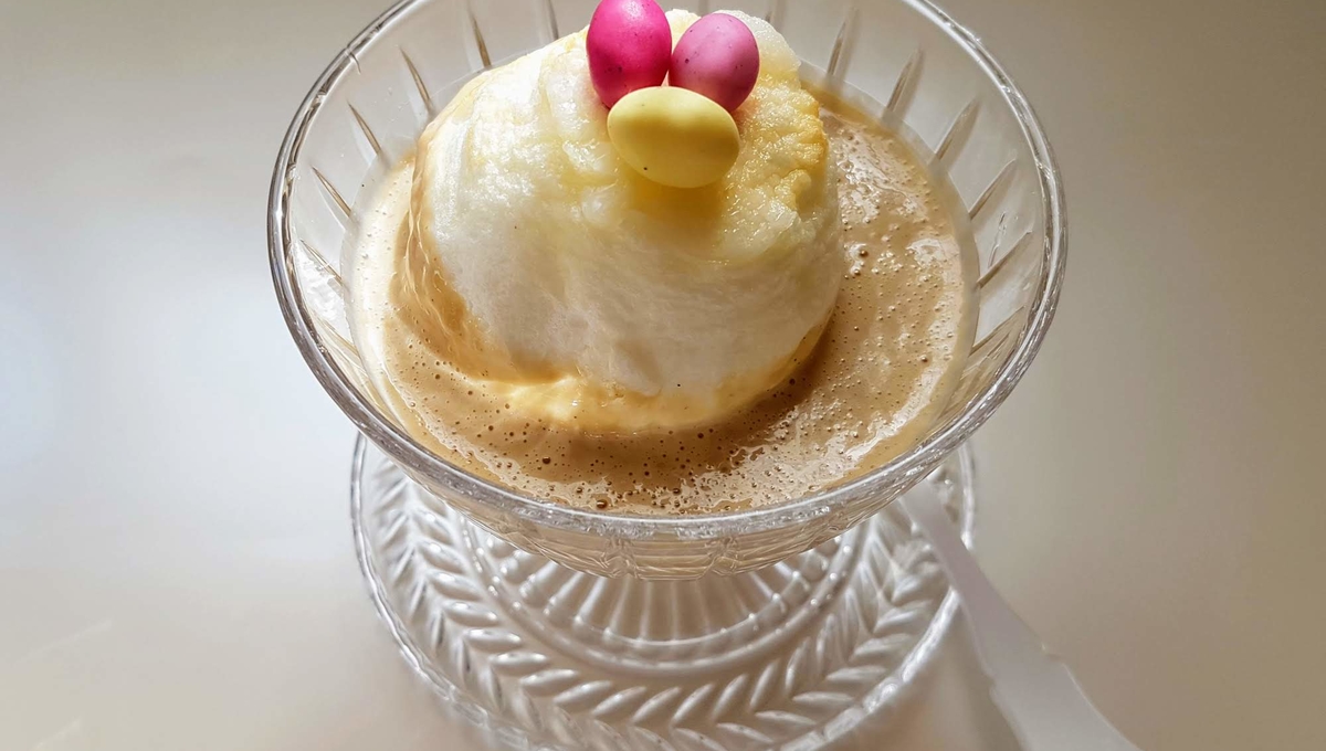 Un dessert classique revisité à l’occasion de Pâques, avec une crème anglaise au thé, au parfum subtil. Mais la classique crème anglaise à la vanille peut sembler faire davantage l’unanimité. À moins de la parfumer au café. À votre guise. Les petits œufs en sucre marquent cette fête et donnent une touche colorée.