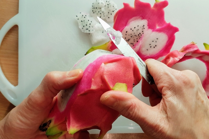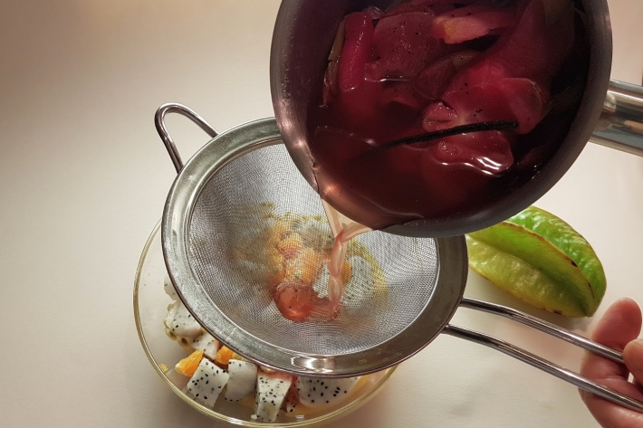 Faites bouillir l’eau avec le sucre, la gousse de vanille fendue dans le sens de la longueur et la peau du fruit du dragon.