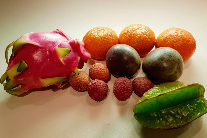 “Pour respecter la recette d’origine, essayez de trouver des mangoustans et des ramboutans, en décembre chez les bons marchands de fruits, à la place ou en plus de mes litchis. Supprimez alors les fruits de la passion et la carambole. Très honnêtement, la carambole a surtout des vertus décoratives, ce n’est fameux…”