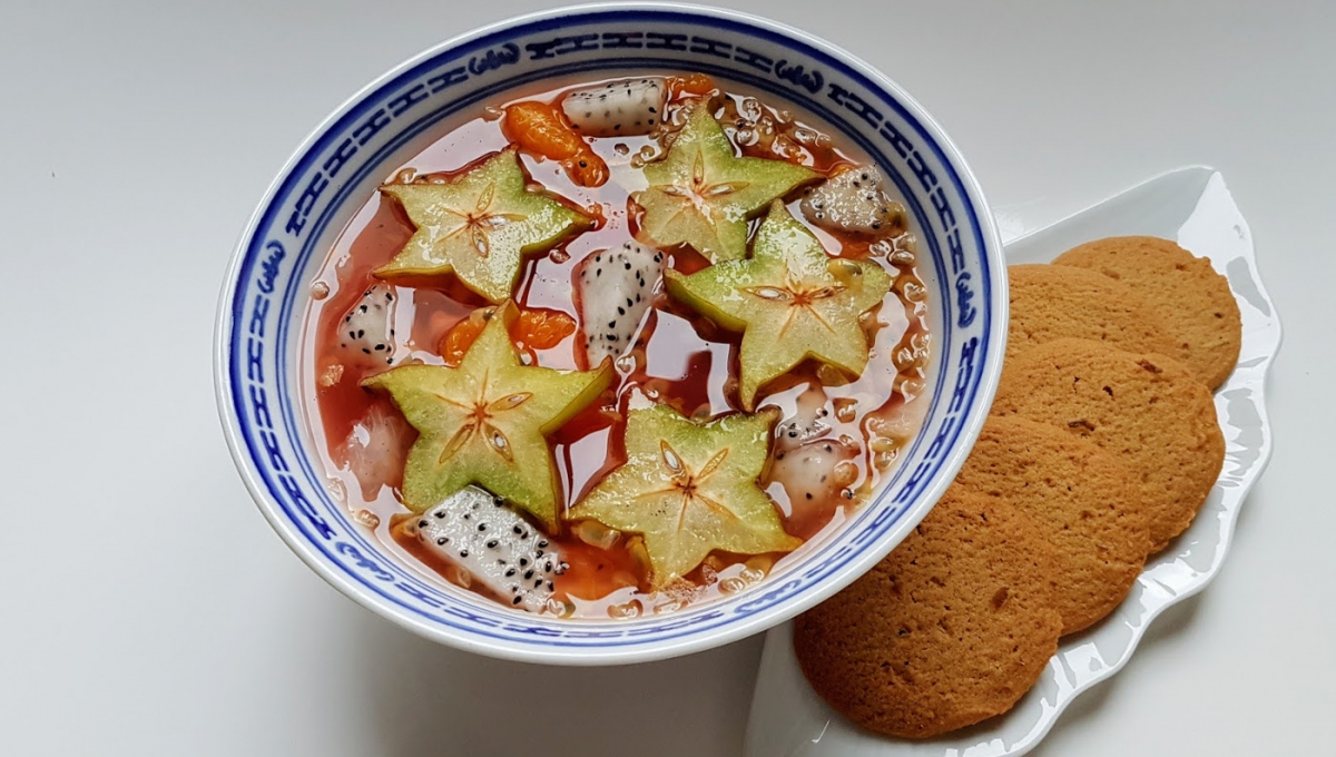 Librement adapté de Pierre Gagnaire parce que la saison des ramboutans et mangoustans, des petits fruits exotiques, avec une chair proche des litchis, est très courte. Je les ai remplacés par ce que j’ai trouvé dans un magasin asiatique, fruits de la passion et litchis, mais le si beau fruit du dragon est resté ! Surtout l’idée de l’infusion.