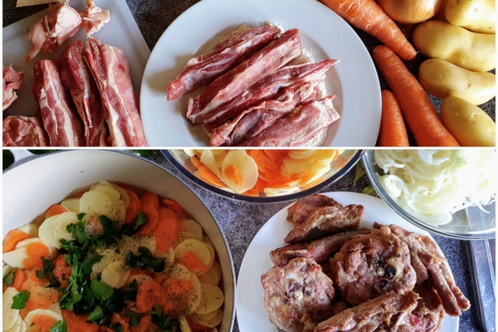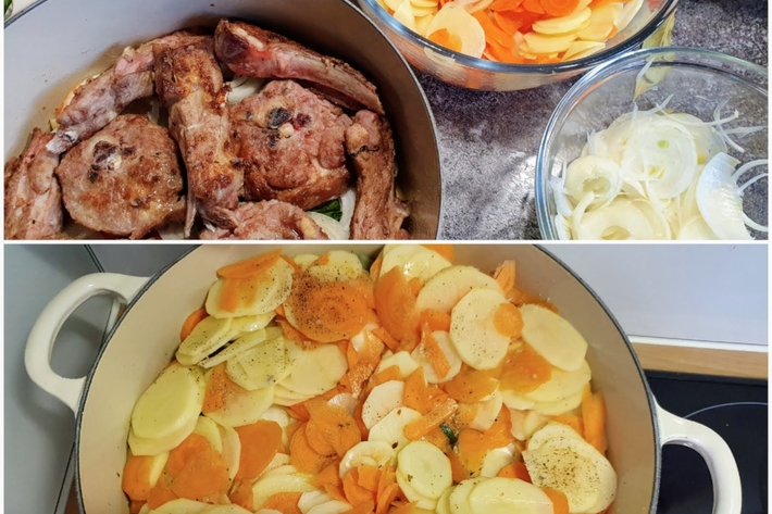 Dans le fond de la cocotte (non lavée), déposez une couche de pommes de terre et carottes, puis une couche d’oignons, salez, poivrez, saupoudrez de thym et/ou persil ciselé.
