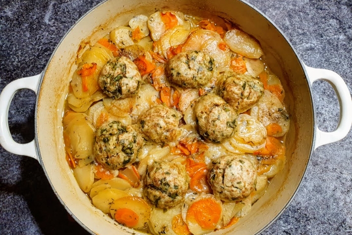 Couvrez et replacez dans le four : les boulettes cuiront sous la vapeur du ragoût. Elles gonflent un peu et le pourtour est légèrement croustillant.