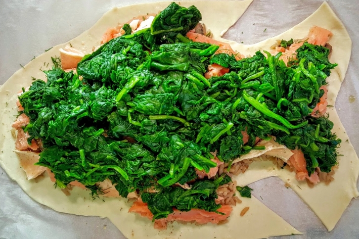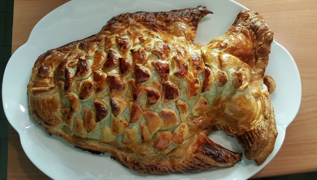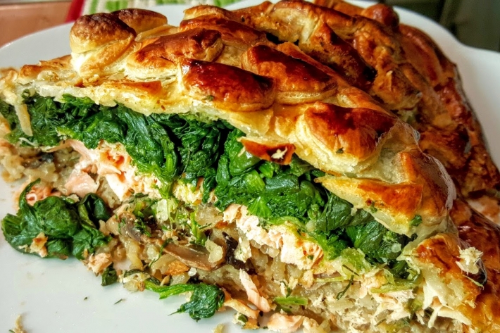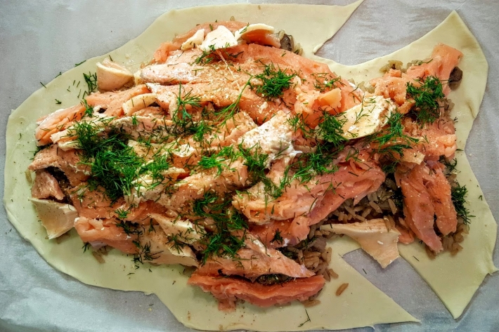 Un classique des réunions ou des fêtes de famille. En forme de poisson, c’est le plat tout trouvé du 1er avril. Le principe est assez simple : c’est un chausson de pâte feuilletée fourré de riz, de champignons, de saumon et d’épinards : le résultat est toujours joli et il se prépare, pour l’essentiel, à l’avance.