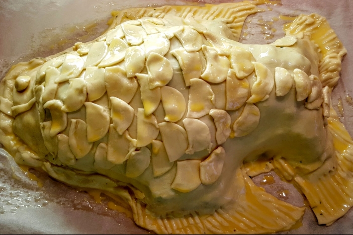 Découpez à la pointe d’une lame la forme d’un poisson sur chaque morceau de pâte (découpez, si possible l’un des deux plus grand) ou, si c’est trop compliqué, formez deux rectangles qu’à la fin, vous quadrillez, par exemple, à l’aide d’une pointe de couteau ou un poinçon.