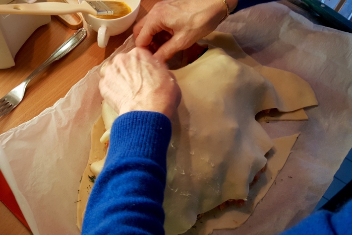 “Si vous optez pour cette forme de poisson, il vous restera probablement des ingrédients. Mais si vous faites un koulibiac rectangulaire, plus classique, tout entrera et vous aurez un koulibiac pour 7 à 8 personnes.”