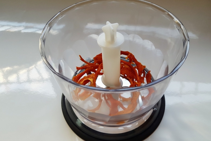 Sur une feuille de papier cuisson, faites sécher ces zestes, en même temps que le pain d’épices, dans le four pendant environ 3 heures, jusqu’à ce que les écorces deviennent cassantes.