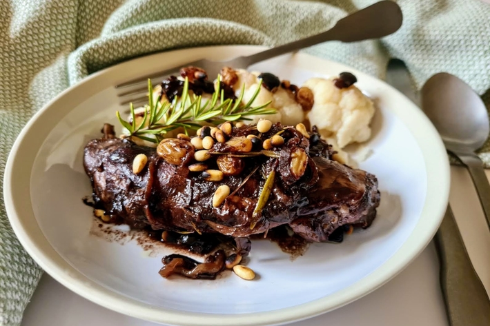 Ce lapin à la sicilienne m’a été servi par une amie qui m’a gentiment communiqué sa recette d’un livre… américain. Elle est au vin rouge, contrairement à la plupart des recettes, qui sont au vin blanc. On y retrouve l’assaisonnement aigre-doux de la caponata. Dé-li-cieux.