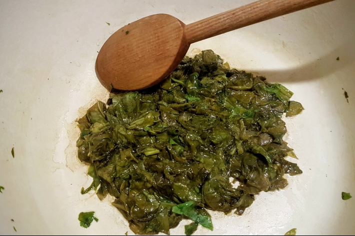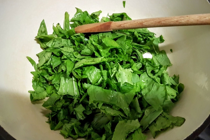 Faites chauffer l’huile dans une cocotte avec l’oseille sur feu moyen en remuant jusqu’à ce qu’elle ait rendu son eau et réduit : ne comptez pas plus de de 2 ou 3 minutes.