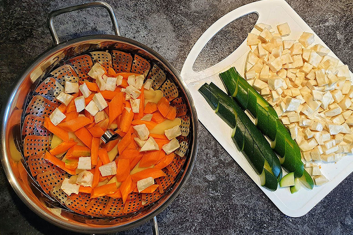 Déposez les carottes, pommes de terre et, le cas échéant, les poireaux, dans le panier à vapeur, dans un faitout avec 2 ou 3 centimètres d’eau, et commencez à les faire cuire un dizaine de minutes.