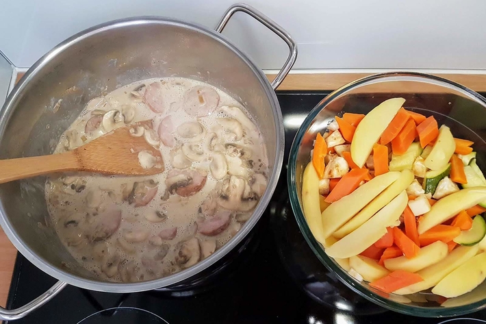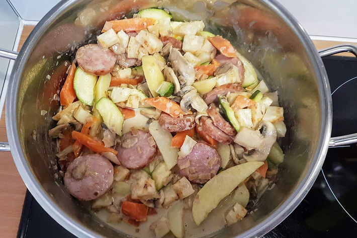 Ajoutez le poison aux légumes et à la saucisse de Morteau.