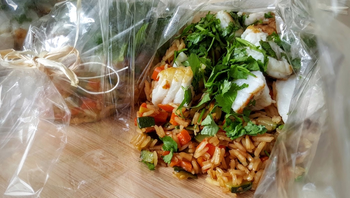 Des légumes avec du riz et de la lotte précuits, préparés dans une papillote et à passer au four au dernier moment. Tout le plat y est.