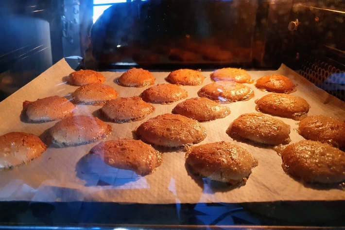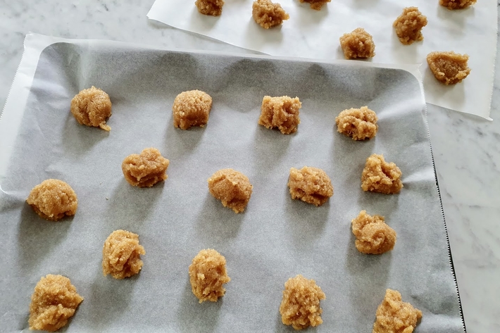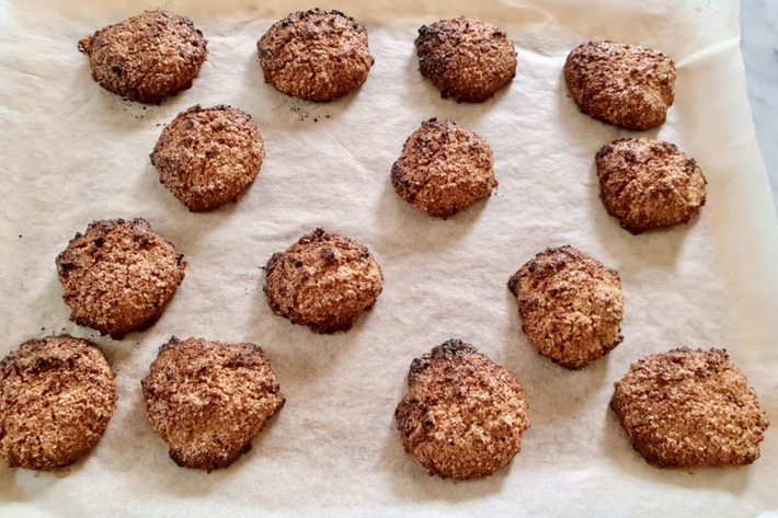 Déposez délicatement des petits tas de pâte sur une feuille de papier cuisson (ou des feuilles de silicone) avec une cuiller à café. Ils s’étalent un peu et forment un rond (la poche à douille est donc inutile).