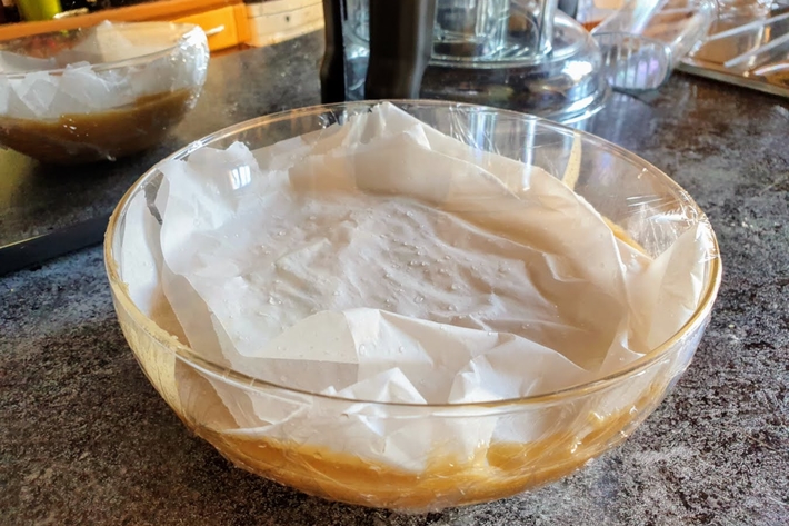 Versez la préparation dans un bol. Recouvrez la pâte d’une double feuille de papier sulfurisé humidifiée pour éviter que le dessus de la pâte ne forme une croûte.