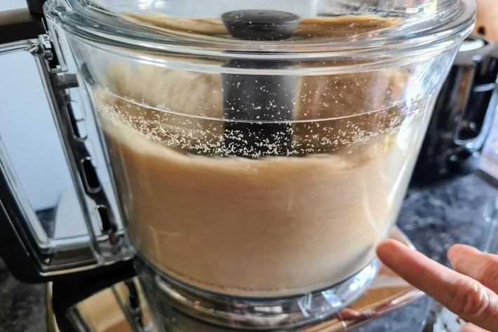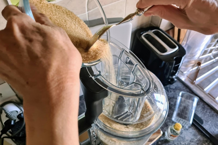 Hachez d’abord grossièrement les amandes par à-coups dans le robot avant d’ajouter les sucres. Puis, broyez plus finement le tout ensemble.