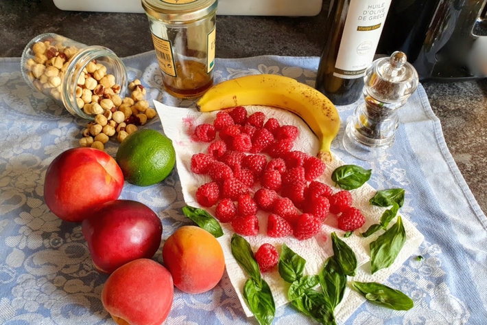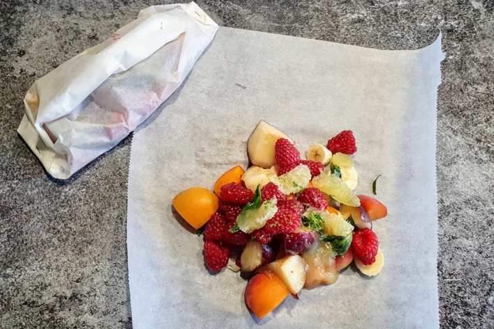 Répartissez les fruits sur la largeur des papillotes : les abricots et les pêches ou les nectarines coupés en morceaux, les bananes en rondelles, les fraises coupées si elles sont un peu grosses et les framboises. Ajoutez les suprêmes de citron vert et leur jus.