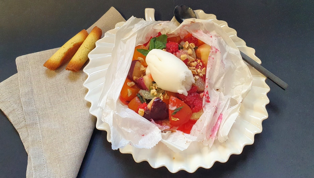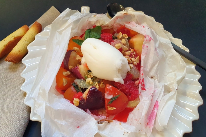 Quoi de mieux, aux beaux jours, qu’un dessert à base de fruits ? Yves Camdeborde les propose cuits au four, en papillote et surmontés d’une jolie quenelle de sorbet, pour un contraste chaud-froid comme j’aime. Une délicieuse recette toute simple.