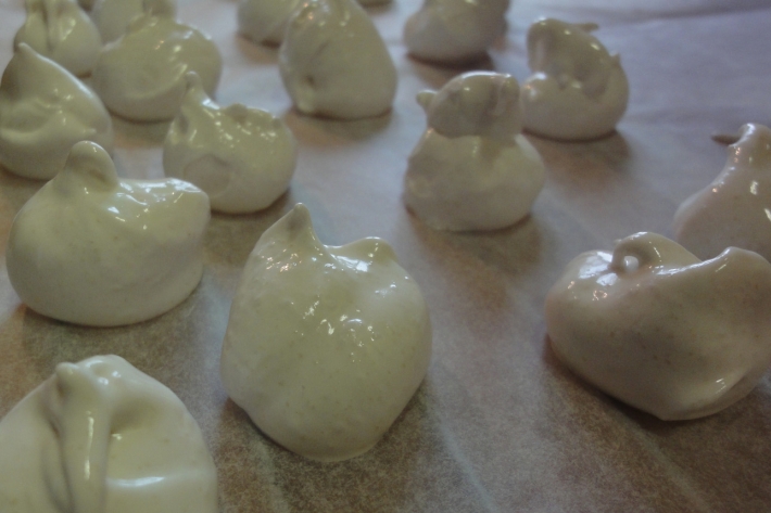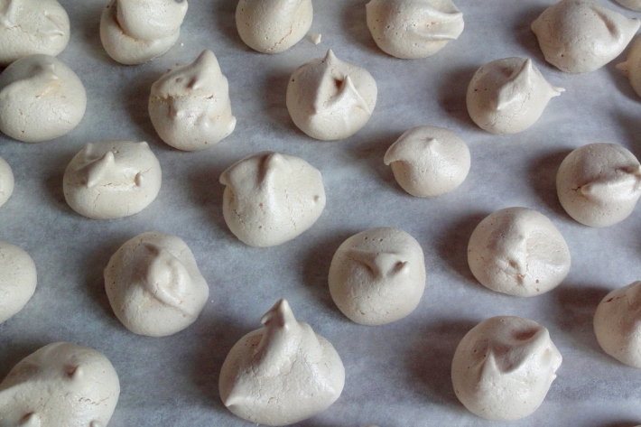 Faites des petits tas de meringues sur le papier sulfurisé à l’aide de deux petites cuillers à dessert.