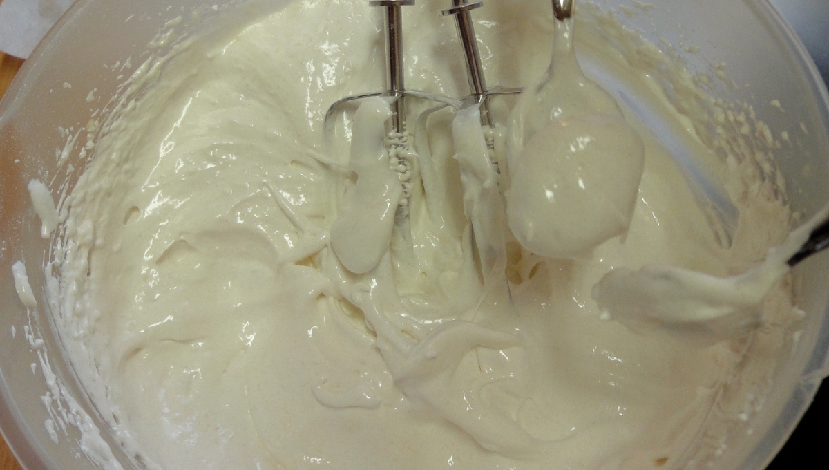 Quand le sirop est 118-119°, diminuez la vitesse du batteur et versez doucement le sirop de sucre sur les blancs montés.