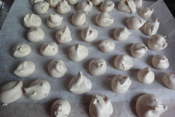 Constituez des petits tas de meringues sur le papier sulfurisé à l’aide de deux petites cuillers à dessert.