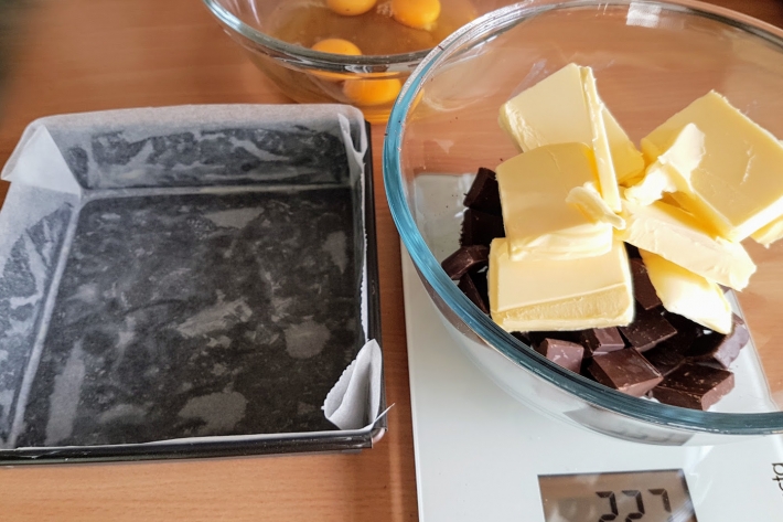Beurrez le moule et chemisez le moule de papier cuisson adapté aux dimensions.