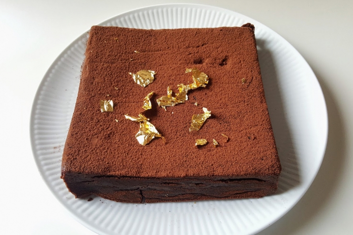 J’ai voulu ajouter au décor des morceaux de feuille d’or, extrêmement délicats à manier, mais je reconnais vraiment manquer de technique. Renoncez à les attraper à la pince à épiler sur laquelle les morceaux s’accrochent. Prenez deux bouts de lames de couteaux. Au moindre souffle, les pellicules d’or s’envolent, surtout ne soupirez au-dessus et, quand le gâteau est en attente au réfrigérateur, ouvrez la porte avec grande précaution.