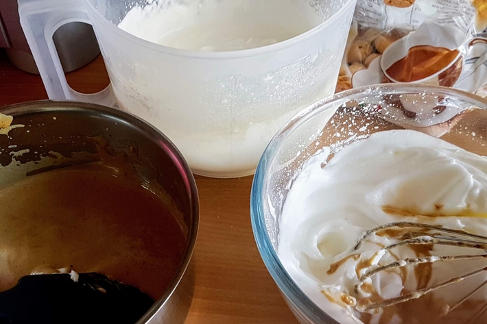 Incorporez délicatement (en soulevant la masse de bas en haut avec une spatule) à la crème au café alternativement un peu de blancs d’œufs en neige et un peu de crème fouettée jusqu’à épuisement des ingrédients.