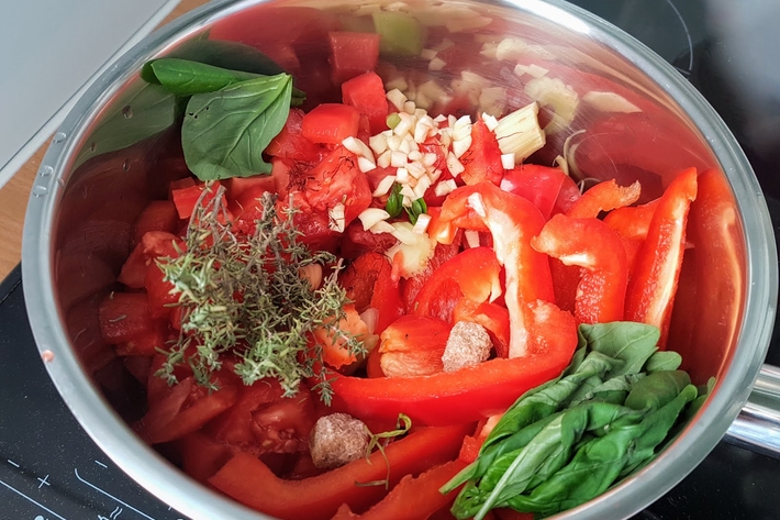 Lavez et essuyez le poivron, coupez-les en quatre et retirez-lui ses pépins. Coupez-le en grosses lanières et ajoutez-le aux tomates.