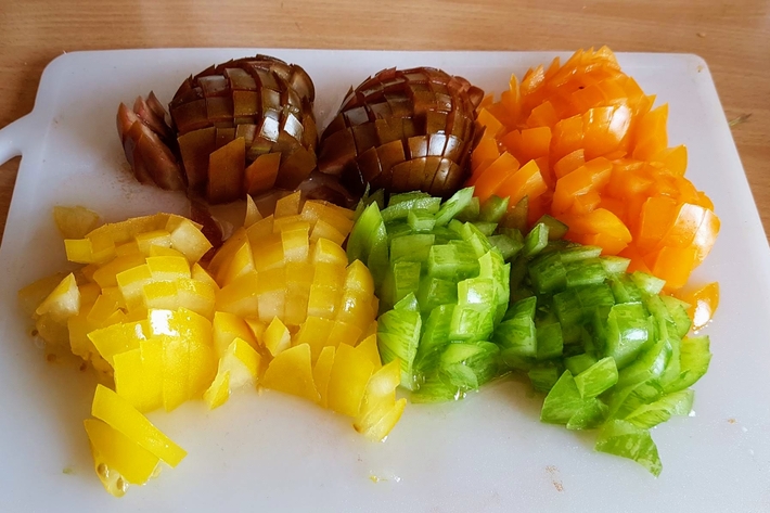 Lavez, essuyez les tomates anciennes et coupez-les en dés. Mélangez-les avec un peu de piment et réservez.