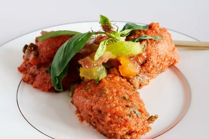 Moulez 3 quenelles par assiette et garnissez de concassé de tomates anciennes.